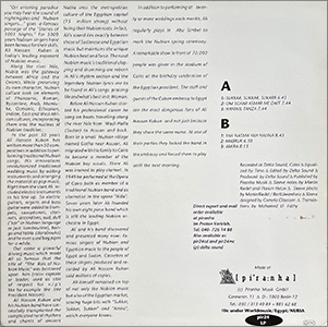 ブラックアフリカ、アラブ、東洋、西洋、その他もろもろが交わる長い長い異文化間交易に育まれたヌビア人固有の伝統音楽をもとに、ギター、ベース、サックス、トランペット、電子楽器、さらにはアコーディオンやバグパイプまで動員する型破りな進化実験を繰り広げ、カイロの移民街を発信源とする都市型ヌビア音楽の革新者として絶大な人気を誇った大スターAli Hassan Kuban。御年60歳でローカルを飛び出し、世界をあっと言わせた89年の1stアルバム。粘りのある音頭調の節回しと土着由来の野性味あふれるビートが醸し出すストロングなグルーヴにもうじっとしてらんない全6曲。大傑作!