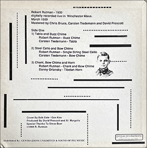 帆状に張られた巨大な板金を弓で弾き擦って演奏する自作の音響彫刻を用いたサウンドパフォーマンスを軸に、絵画、詩、彫刻、演劇、映画といったマルチメディアに相互接続された総合芸術へと創作の場をひろげている、ドイツ生まれの異能アーティストRobert Rutman。89年にボストン近郊のウィンチェスターで行われたライヴパフォーマンスの模様が収録されている、同年発表の一枚。試聴は、びりびりとひずんだ響きを放つ音響彫刻に打楽器を交えた編成による、架空の民族儀式仕立ての一幕から。打楽器奏者は、ここから第四世界的エスノ探求を深めていくCarsten Tiedemann(ex Mo Boma)。大推薦盤!